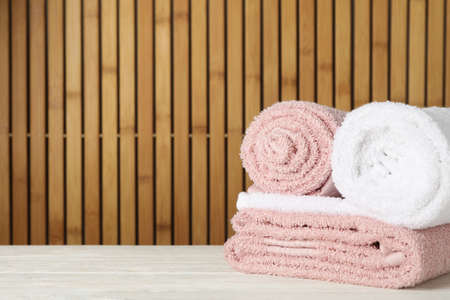 Folded towels on wooden table against bamboo background, space for text