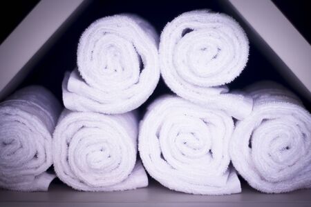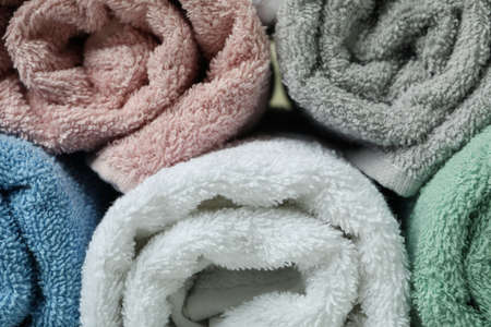Clean rolled towels on whole background, close up