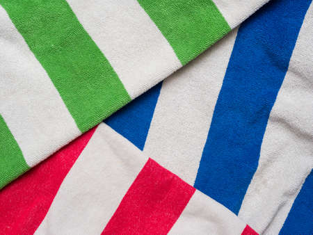 Colorful towels on a blue and green background with copy space.