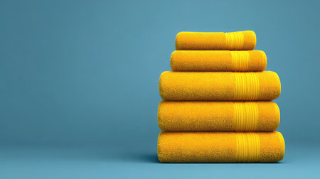 A collection of vibrant yellow towels arranged in a neat stack against a soft blue background, perfect for adding warmth and cheer to any bathroom space or decor theme.