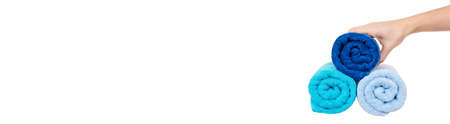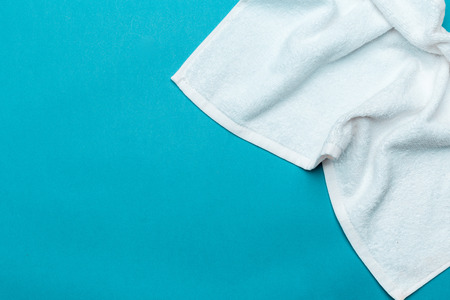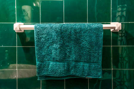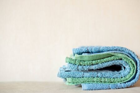 blue and aqua green clean towels soft hygiene at home in bathroom background.
