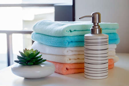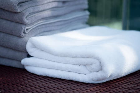Close up of stack of shower towel on table.