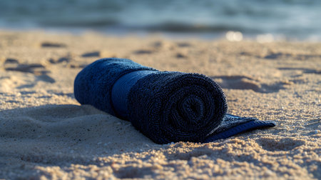 Close up of a navy blue rolled towel on beach sand. Vacation Background with Copy Space