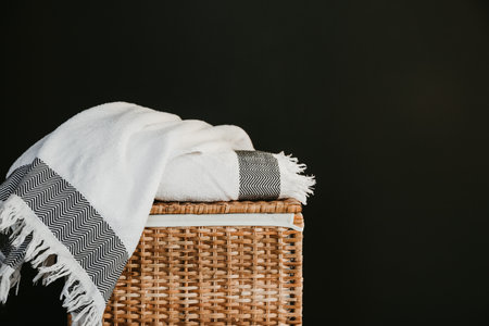 White cotton towels on a rattan box against black wall in a laundry.