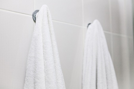 White towels hang on the wall in the bathroom. Cleanliness, shower.