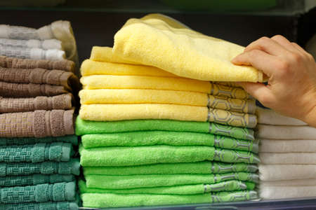 A man's hand picks up a yellow towel from a stack on a store shelf