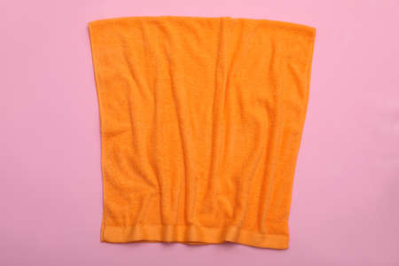 Crumpled orange beach towel on pink background, top view