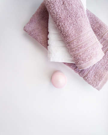 Pink and white towels with cotton pads and candle on the white background. Bathroom decor and accessories. copyspace.