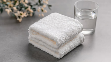 A serene setting featuring soft white towels neatly stacked next to a glass of fresh water, creating a tranquil and refreshing atmosphere. Perfect for spa or home decor.