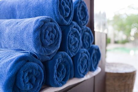 pile of rolled folded blue towel in spa resort