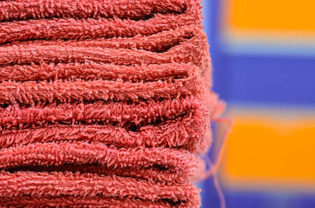 Textured red bath towels stacked close up.