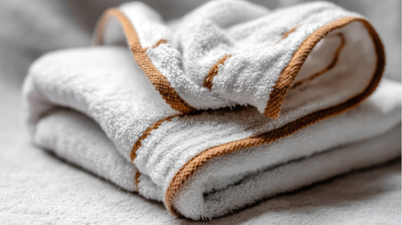Photograph shows two white, fluffy towels stacked neatly, with the upper towel partially unfolded to reveal its textured terry loops and a contrasting thin brown woven trim along the edge, resting on a soft white background.