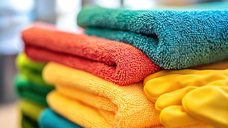 This image features a vibrant stack of microfiber towels in bright colors paired with yellow cleaning gloves, ideal for promoting household cleaning and organization supplies.