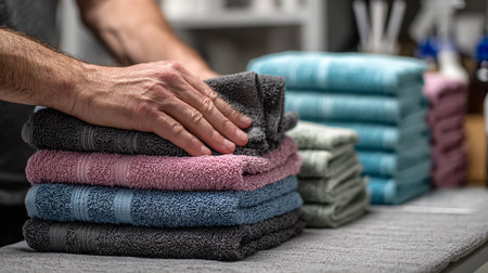 Close-up of a stack of towels in the hands of a man