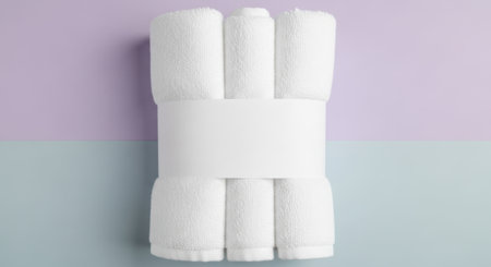 A serene image showcasing a neat stack of white towels against a light blue background, ideal for spa themes, wellness, cleanliness, and luxury decor.