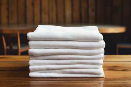 Stacked white towels on table, folded.