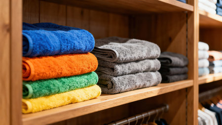 Colorful towels on shelves in the bathroom. Shallow depth of field