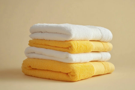 Stack of soft yellow and white towels on a pastel background, perfect for home decor, bath aesthetics, or spa ambiance, symbolizing cleanliness and comfort