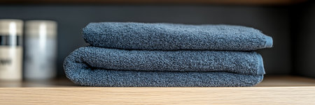 A collection of soft grey towels stacked neatly on a minimalist wooden surface. Perfect for conveying tranquility and elegance in home or bathroom decor.