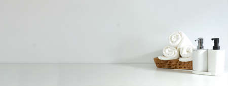 Shampoo bottles, cotton towels and aroma candle on white background.