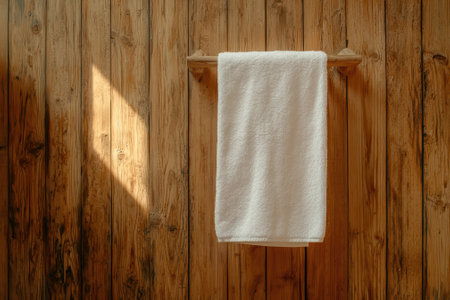 Clean white towel hanging on a wooden rack in a bathroom.