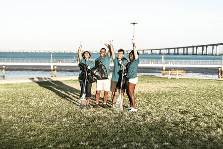 Group of happy volunteers celebrating success outdoors. Mix raced men and women wearing uniforms, standing on grass, holding rakes and plastic bags and making winner gestures. Success concept