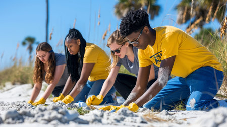 Diverse group of young volunteers cleaning sandy beach littered with plastic waste under sunny sky