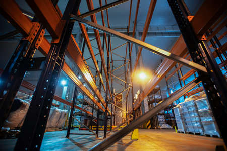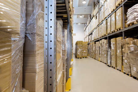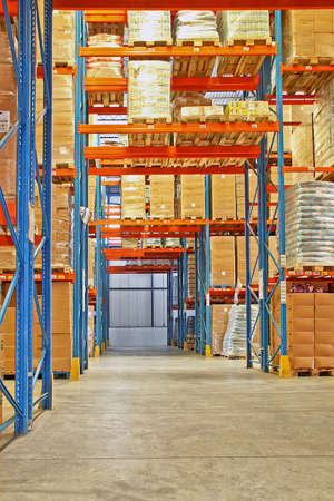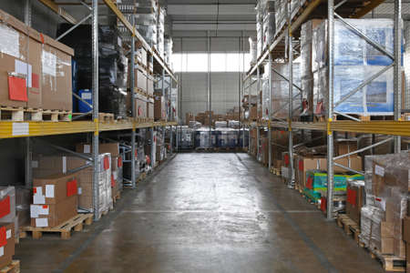 Warehouse interior with rows of shelves and boxes. Industrial background.