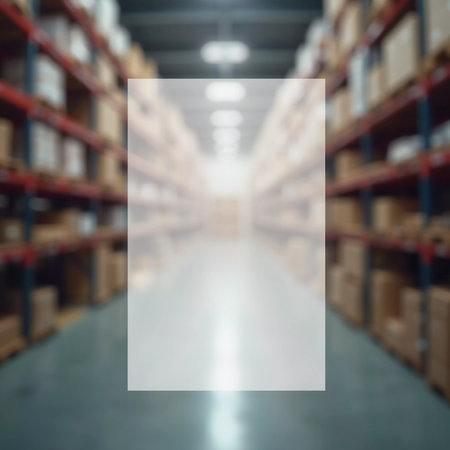 Blurry image of modern warehouse shelves capturing a contemporary storage environment