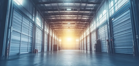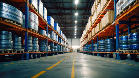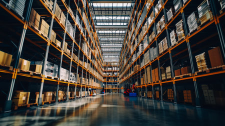 Commercial warehouse spacious distribution center with tall shelves in industrial logistics setting