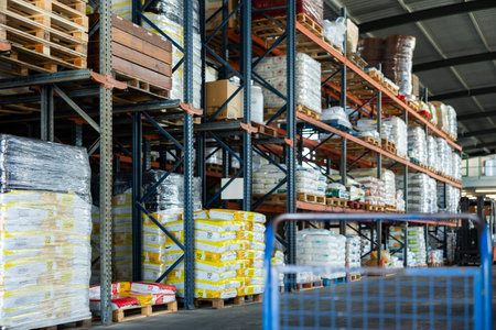 Paper sacks with fertilizer on racks and pallets in warehouse, wholesale store