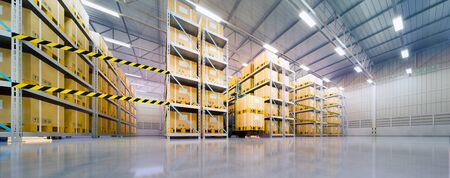 3d rendering of warehouse building and box packaging in shelf suitable for industrial background.