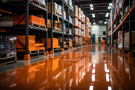 Warehouse interior with rows of shelves and boxes in a large warehouse