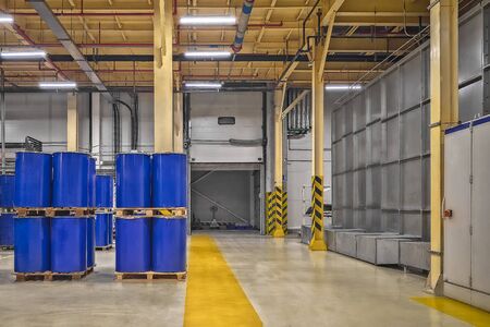 Blue metal barrels. Chemical industry. Metal barrels for chemicals. Storage racks. Barrels are stored in a warehouse. Warehouse storage.