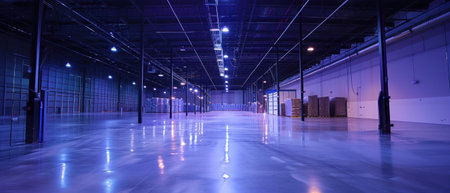 Big empty warehouse interior in logistic center. Concept of organized storage, logistics efficiency, and clean distribution space.