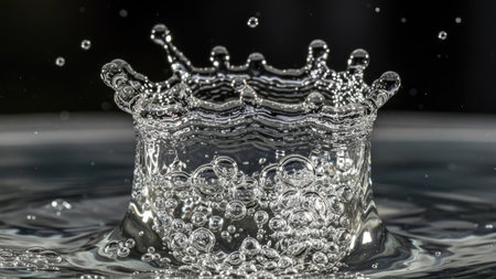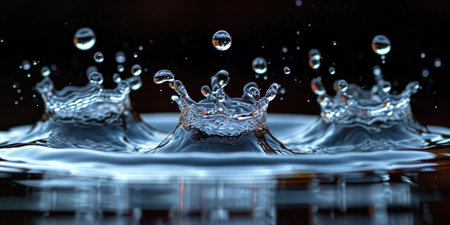 A mesmerizing close-up image of water splashing, featuring glowing droplets and beautiful ripples on a reflective surface, capturing the essence of motion and beauty.