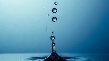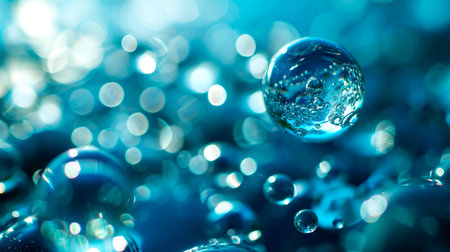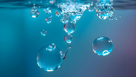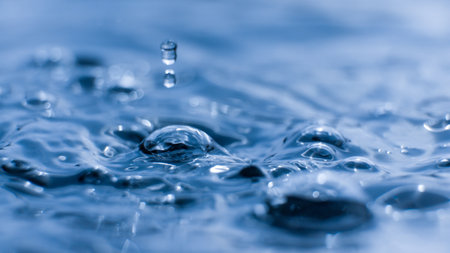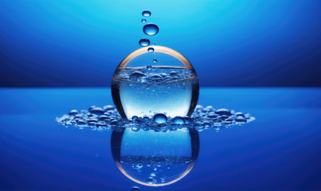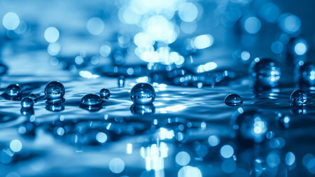 This captivating image features close-up water droplets creating ripples and bubbles on a calming blue surface, evoking tranquility and freshness.