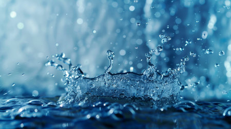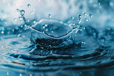 A detailed close-up of a water splash captured mid-action, with a blue bokeh background adding depth and a sense of movement to the scene.