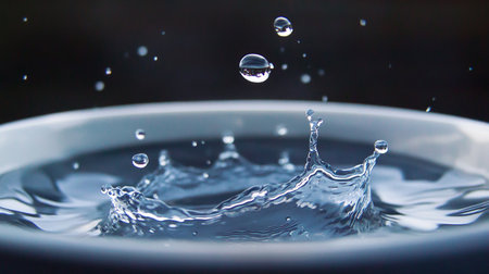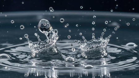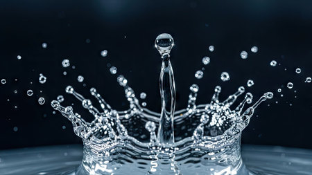 Close-up of a dramatic water splash with droplets frozen mid-air, creating a dynamic and fluid visual against a dark background.