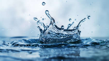 Close-up of a water splash with clear droplets frozen in motion, set against a soft, blurred background, capturing the beauty of fluid dynamics.
