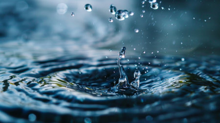 A close-up captures water droplets impacting the surface, generating ripples. The image showcases the dynamic interaction between water and its movement. The focus is sharp, highlighting the details of the droplets and wave patterns. Ideal for illustrating concepts related to fluidity and scientific applications.