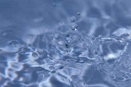 Close-up of water droplets splashing in a pool of blue water, capturing the freshness and purity of the liquid.