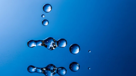 A collection of water droplets, both spherical and irregularly shaped, are suspended in a vibrant blue gradient background. The clear, transparent liquid forms abstract shapes, showcasing the effects of surface tension and fluid dynamics. The lighting highlights the reflections and refractions within the droplets, creating a dynamic and visually interesting composition that feels both scientific and artistic.