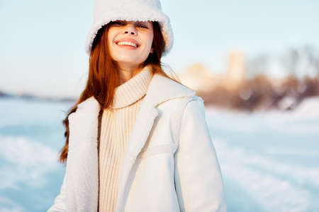 beautiful woman in a white coat in a hat winter landscape walk nature