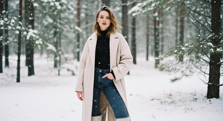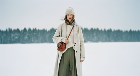 A fashionable woman posing in a snowy landscape, wearing a stylish coat and gloves, with a soft focus on the winter scenery in the background