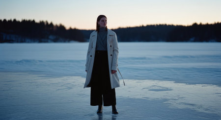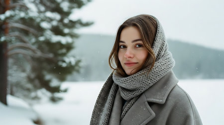 A woman standing in a snowy landscape, wearing a warm coat, scarf, and gloves, surrounded by pine trees and a frozen lake