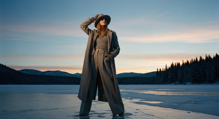 Beautiful young woman in long coat and hat standing on frozen lake at sunset