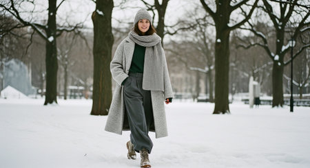 A woman walking in a snowy park, wearing a gray coat, scarf, and hat, with trees in the background