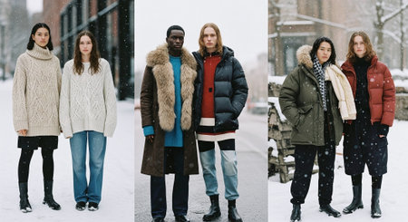 A winter fashion photoshoot featuring models in cozy sweaters, puffer jackets, and stylish outerwear in a snowy urban setting