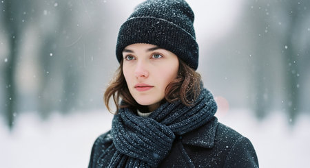 A young woman wearing a black beanie and scarf, standing in a snowy landscape, with soft snowflakes falling around her, conveying a serene winter atmosphere